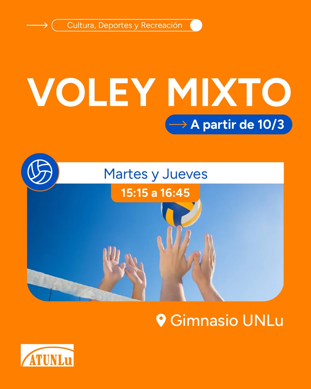 A partir del 10 de marzo, todos los jueves de 15.15 a 16.45 horas en el Gimnasio de la UNLu habrá Voley Mixto. Es una actividad organizada por ATUNLu para…
