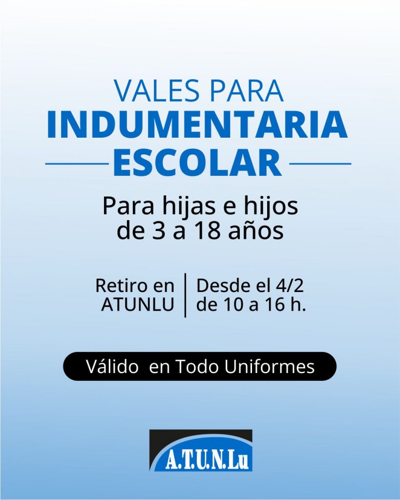 A partir de este miércoles 4 de febrero, de 10 a 16 horas, las afiliadas y afiliados a ATUNLu pueden pasar por las oficinas del sindicato a retirar el vale para indumentaria escolar de Todo Uniformes, para sus hijas e hijos, de 3 a 18 años que cursen jardín de infantes, escuela primaria o secundaria.